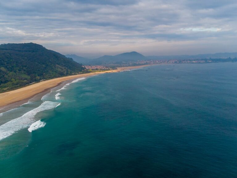 Noja in Cantabria delivers classic Atlantic beachbreak surf across its expansive sandy shores backed by pine forests and dunes, offering consistent northwest swells perfect for all levels. Ris Beach serves as the main surf hub with multiple peaks and quick access from nearby Trengandín, creating Noja’s reputation as a reliable Cantabrian surf destination.