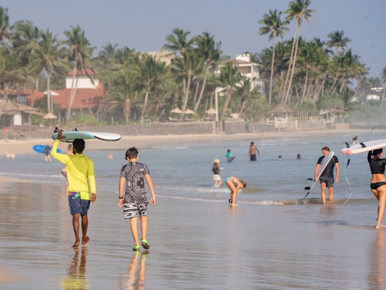 Ahangama’s surf houses offer all-inclusive packages combining beachfront accommodation, daily lessons, and progression from beachbreak to nearby reef spots like Coconuts Point.